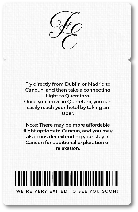 Fly directly from Dublin or Madrid to Cancun, and then take a connecting flight to Queretaro. Once you arrive in Queretaro, you can easily reach your hotel by taking an Uber.